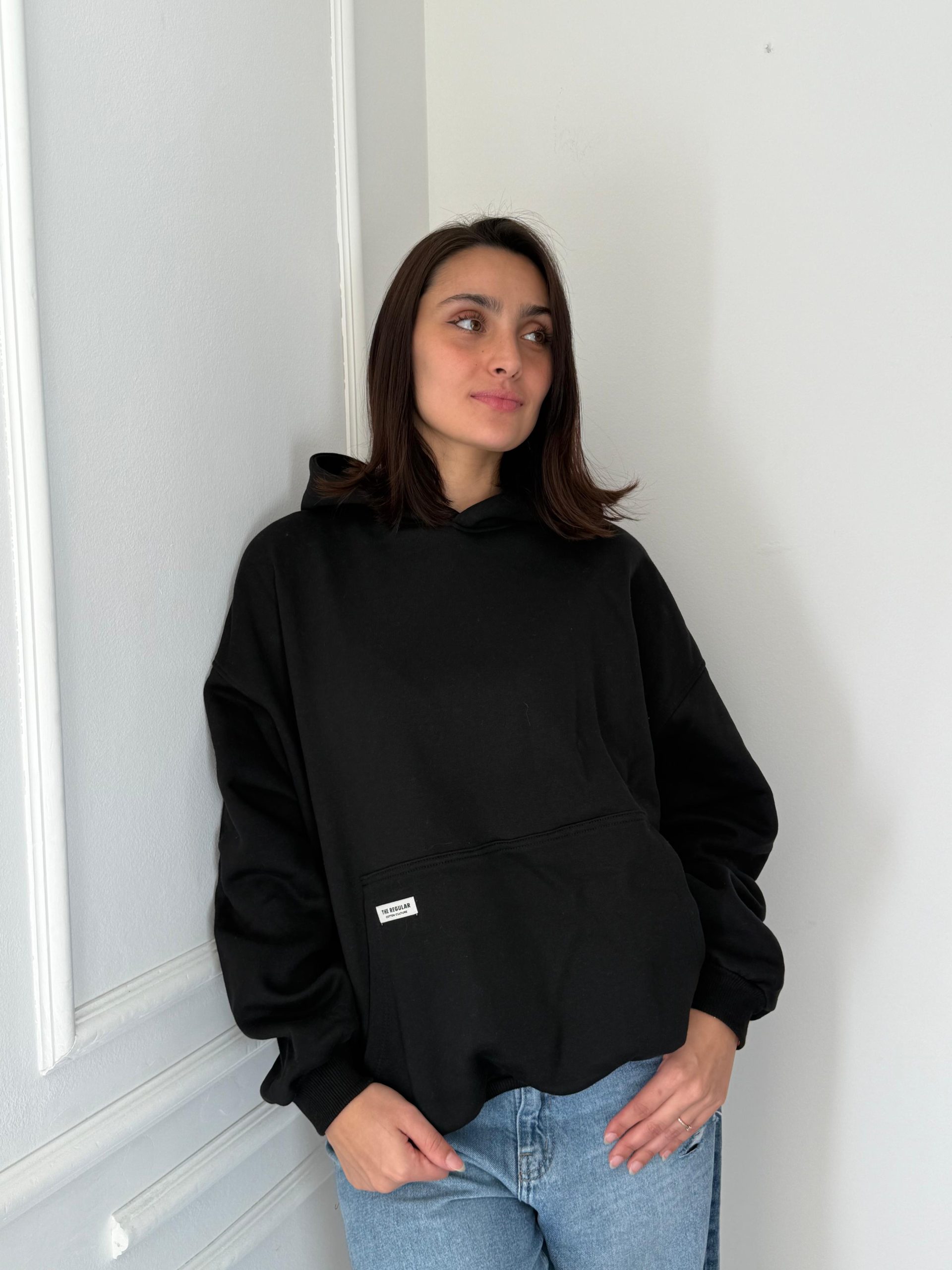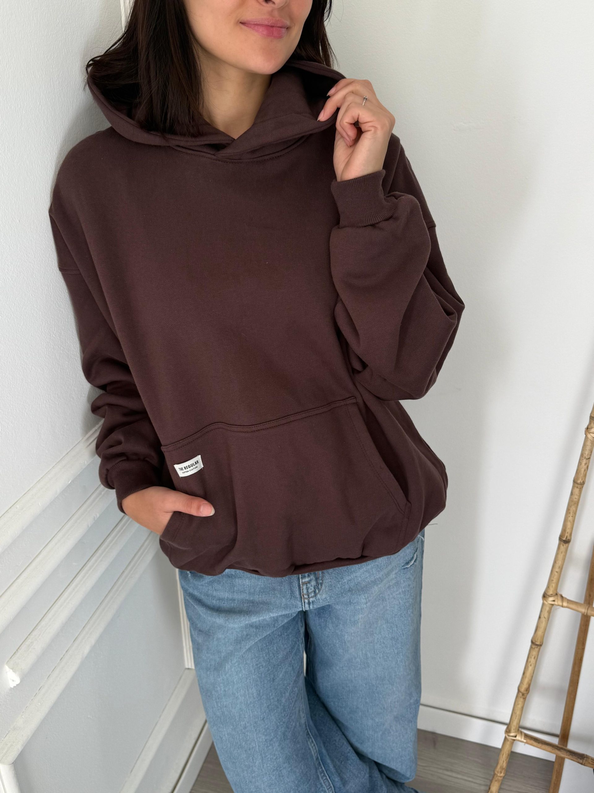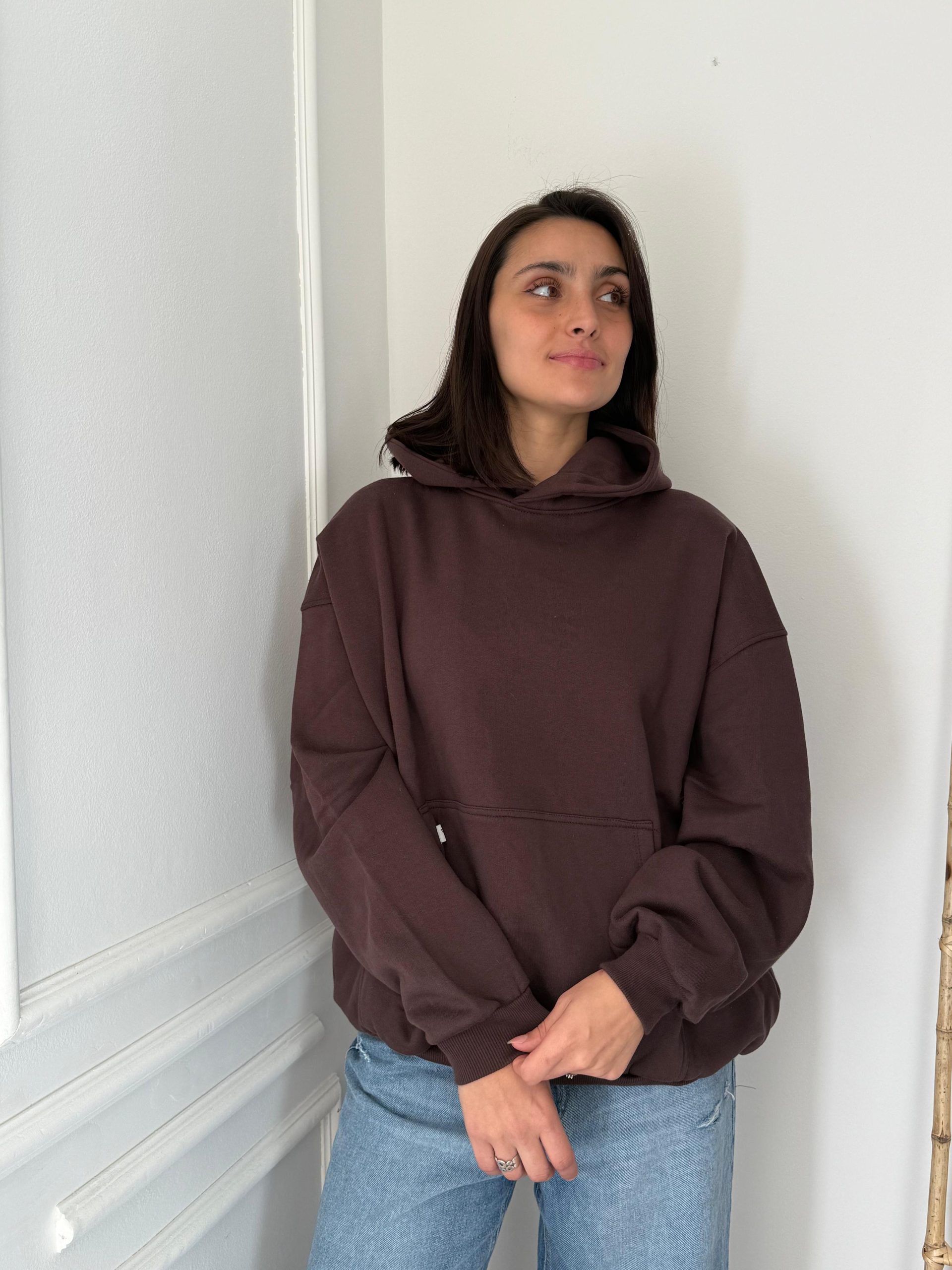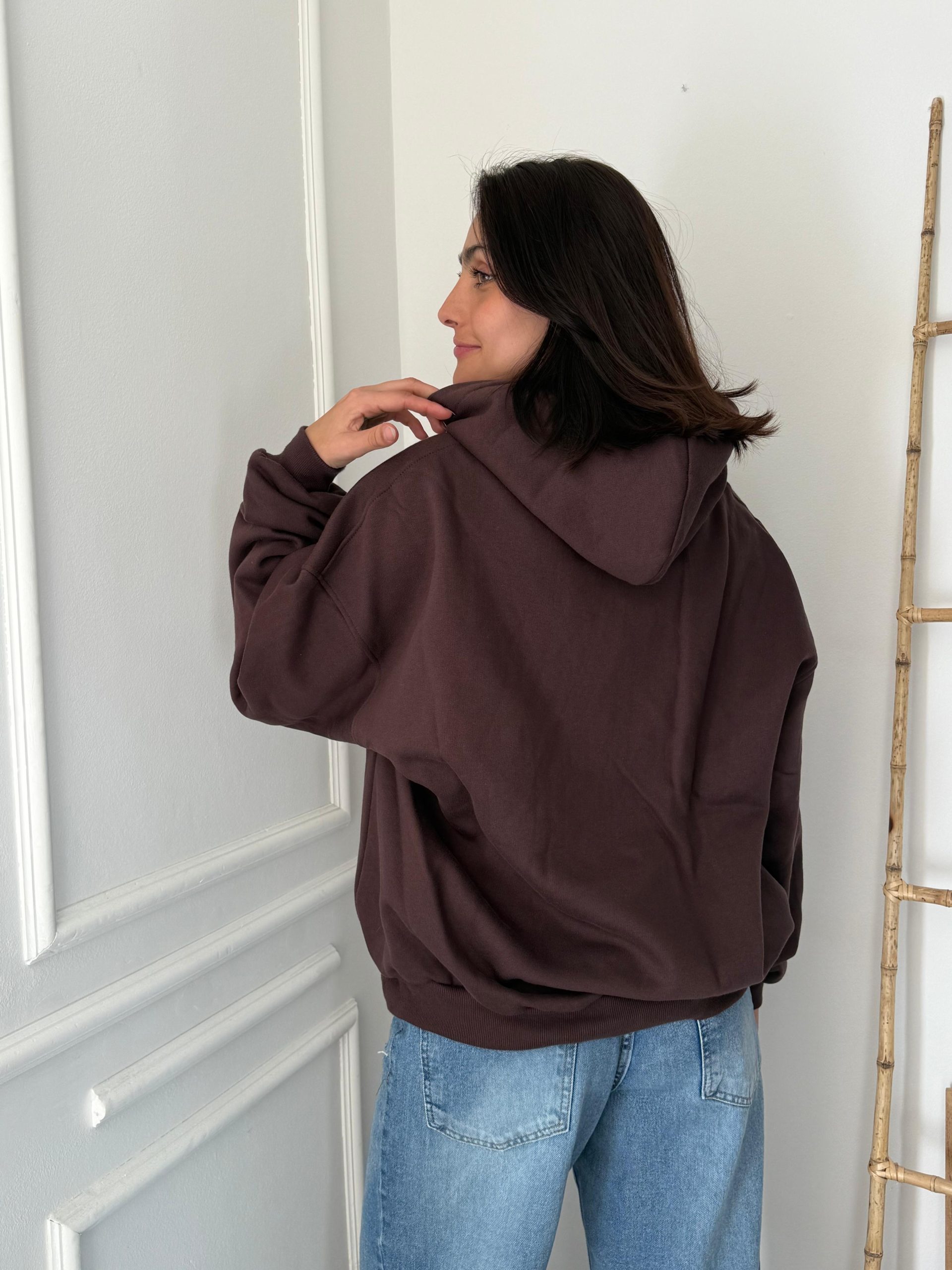Modelo over con capucha, puño y  frizado.