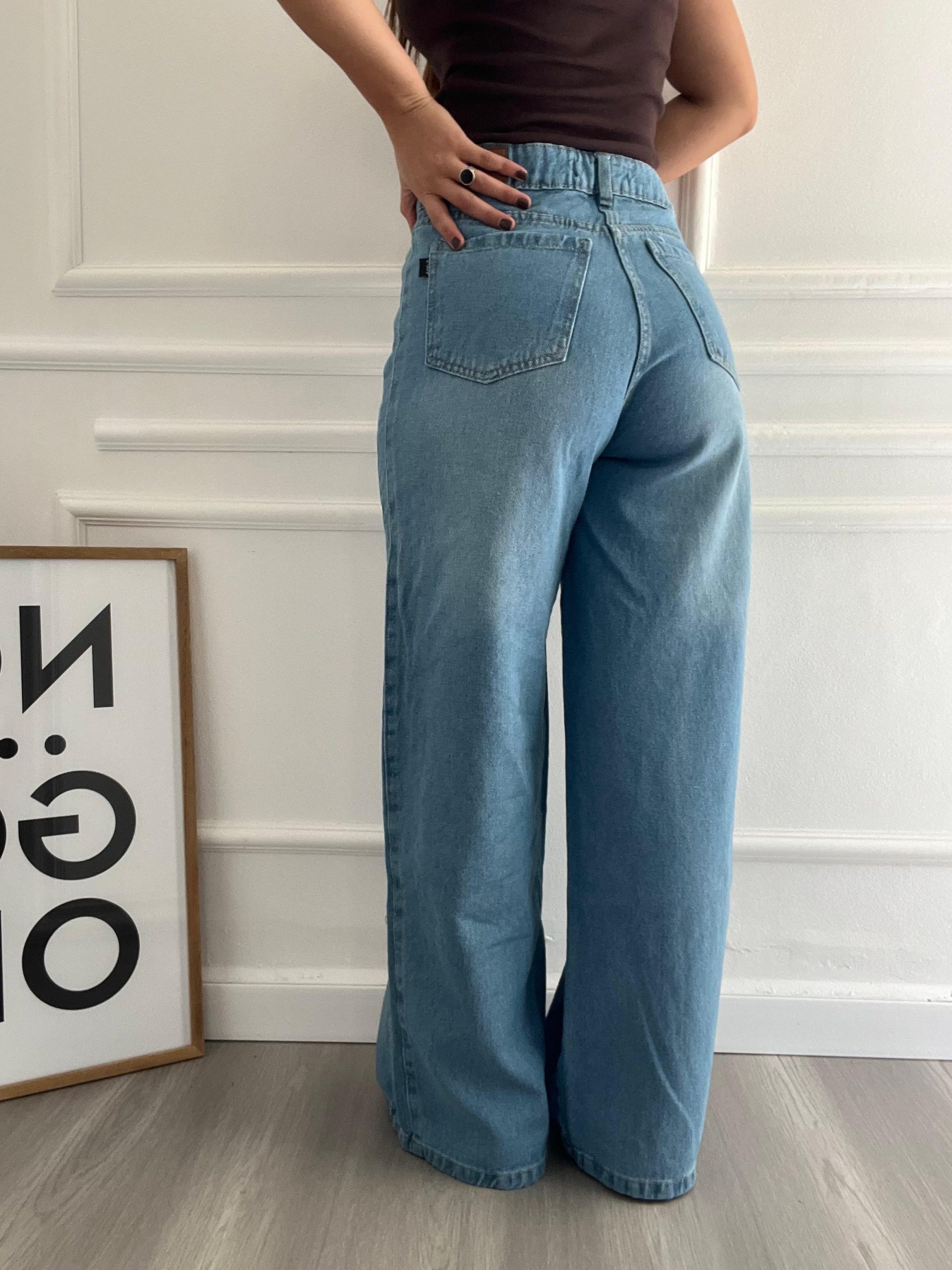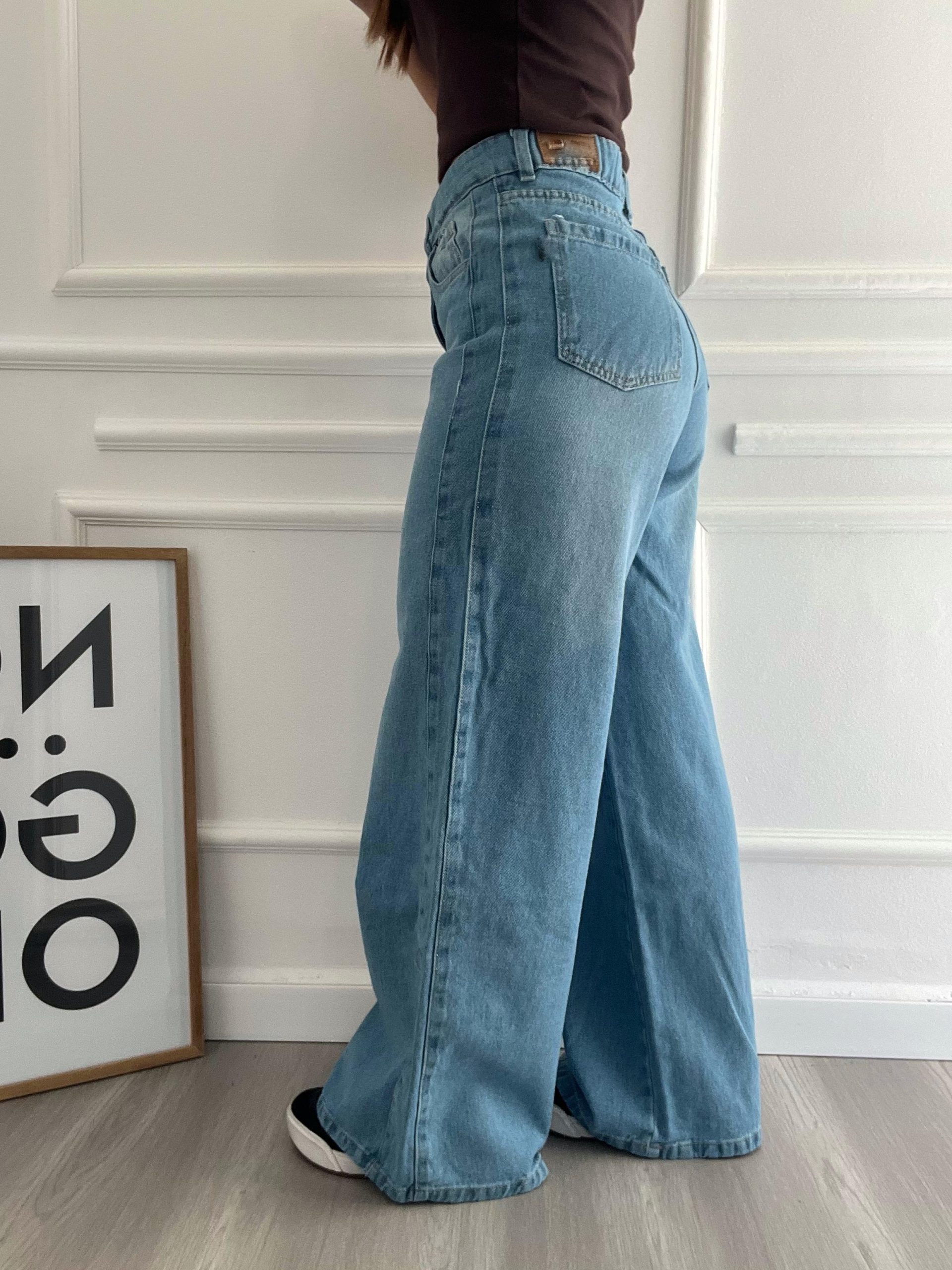 Tiro alto azul gastado recorte costado 36- cintura 35cm/cadera 57/largo 100cm 38- cintura 36cm/cadera 59/largo 100cm 40- cintura 38cm/cadera 61cm/largo 100cm 42-cintura 39cm/cadera 62cm/largo 107cm (las medidas son tomadas con la prenda plana y sin estirar )